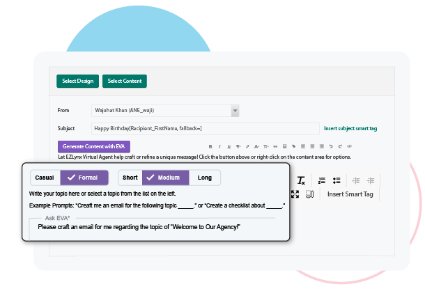 Insurance agents spend a large portion of their day handling client communications, checking on quote status, managing claims, and performing other routine tasks that could benefit from increased efficiency. That’s where artificial intelligence (AI) comes in – to take your busywork, not your job. Our AI-powered tool EZLynx Virtual Assistant™ (EVA) is designed specifically for insurance agencies like yours and includes a slew of features to enhance the way you work and how you engage with your clients. Whether you’re prepping for meetings, drafting emails, or looking for EZLynx product help, EVA does the heavy lifting, leaving you more time to focus on what you do best.